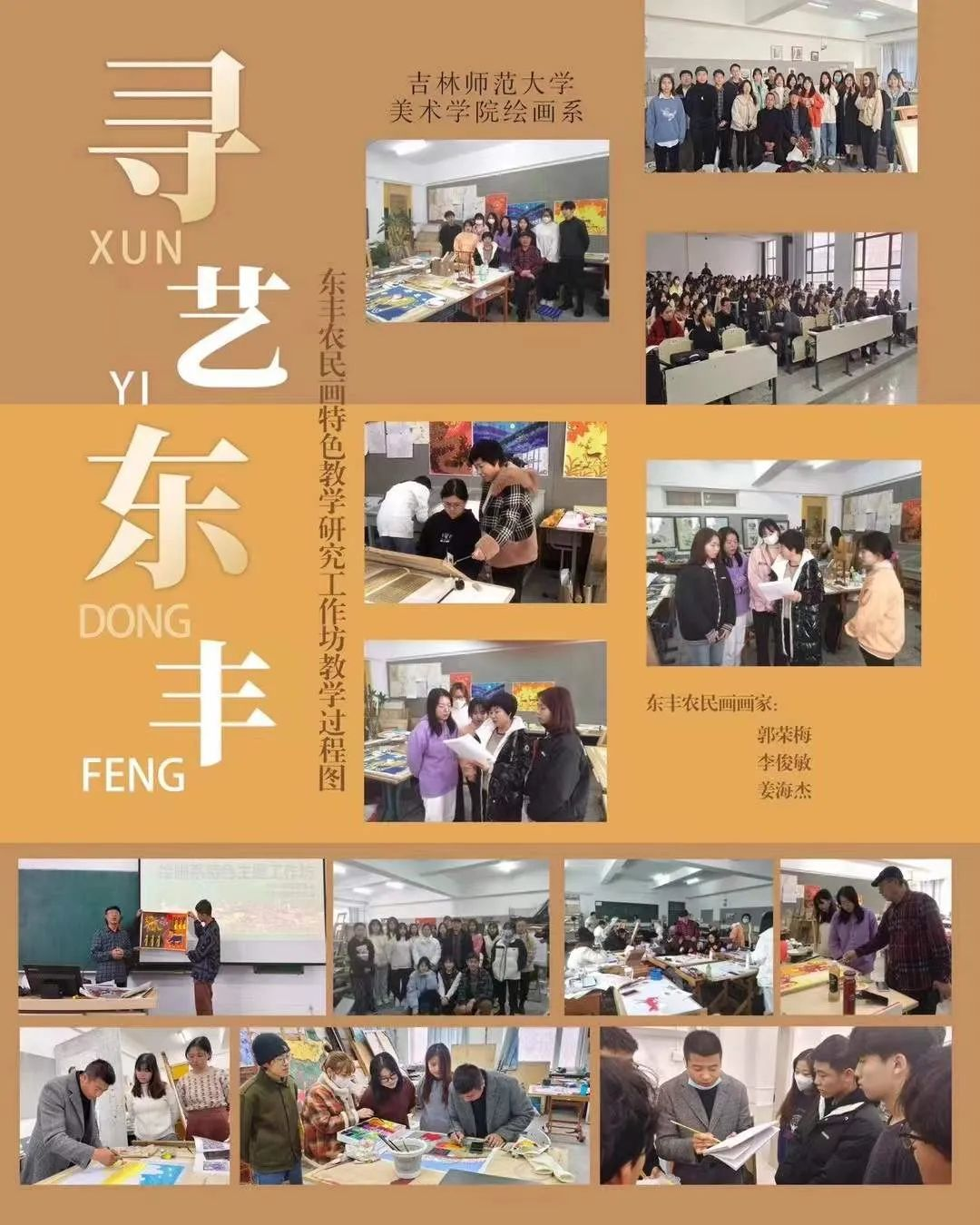 2021年11月,绘画系与省级人文社科重点研究基地东丰农民画研究中心联合举办“东丰农民画特色教学研究工作坊”,邀请画家交互授课,并于12月举办教学成果展和学术研讨会,体现出学院在课程思政教学改革和文化传承创新等方面的融合实践。
