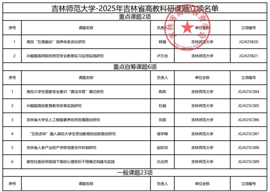 吉林省高教科研课题旨在深入学习习近平总书记在“两会”期间关于“教育强省”、“科技强省”、“人才强省”工作的重要论述,贯彻落实教育部2025 年高等教育改革发展有关工作的部署,探索新时期高等教育教学与科研工作中的学术理论与实践问题。