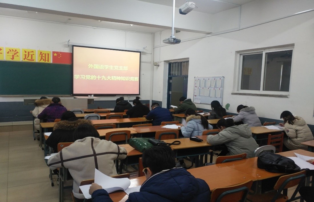 为深入学习党的十九大精神,外国语学院学生党支部于2017年11月30日下午13:00在2307教室举行“学习党的十九大精神”知识竞赛,全体在校党员参加。最终,侯卓君获得一等奖;于晶晶和于士淇获得二等奖;景超,潘思羽,...
