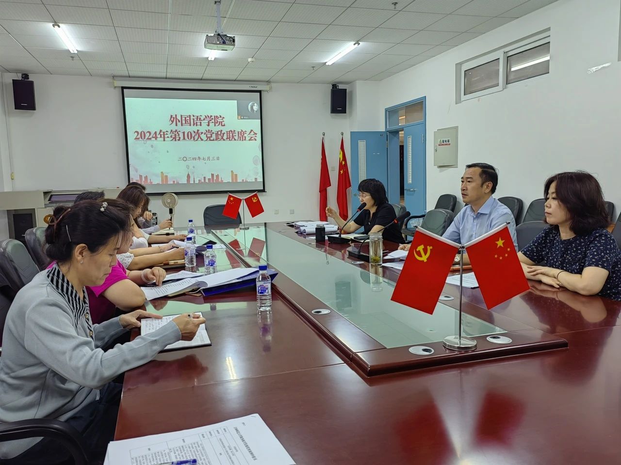 7月3日下午,学院在双创2楼会议室召开外国语学院第10次党政联席会议,院长李淑华、党委书记韩强、副院长赵岩、李艳红、潘雁,党委副书记胡晶出席会议,各专业系主任参加会议。四平、长春两个校区同步网络视频。会议由李淑华主持。李淑...