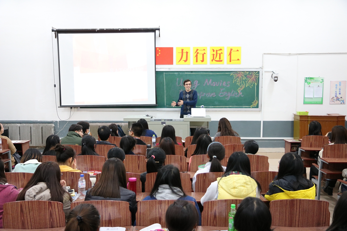 本次讲座的题目为Using Movies to Improve English,主讲人Jonathan以流行美剧《生活大爆炸》为例,向在场听众介绍了如何通过看美剧来提高英语水平,其中包括听力能力,阅读能力,词汇积累能力以及表达能力的提高。主讲人呈现了具体的观看方法,与听讲者进行了相应的互动,大大的吸引了听众,同时也让同学们对于通过电影学英语有了新的思考。图片和视频的呈现,让学生们有了更形象和贴切的理解,大家在轻松愉快的氛围下度过了一个半小时。