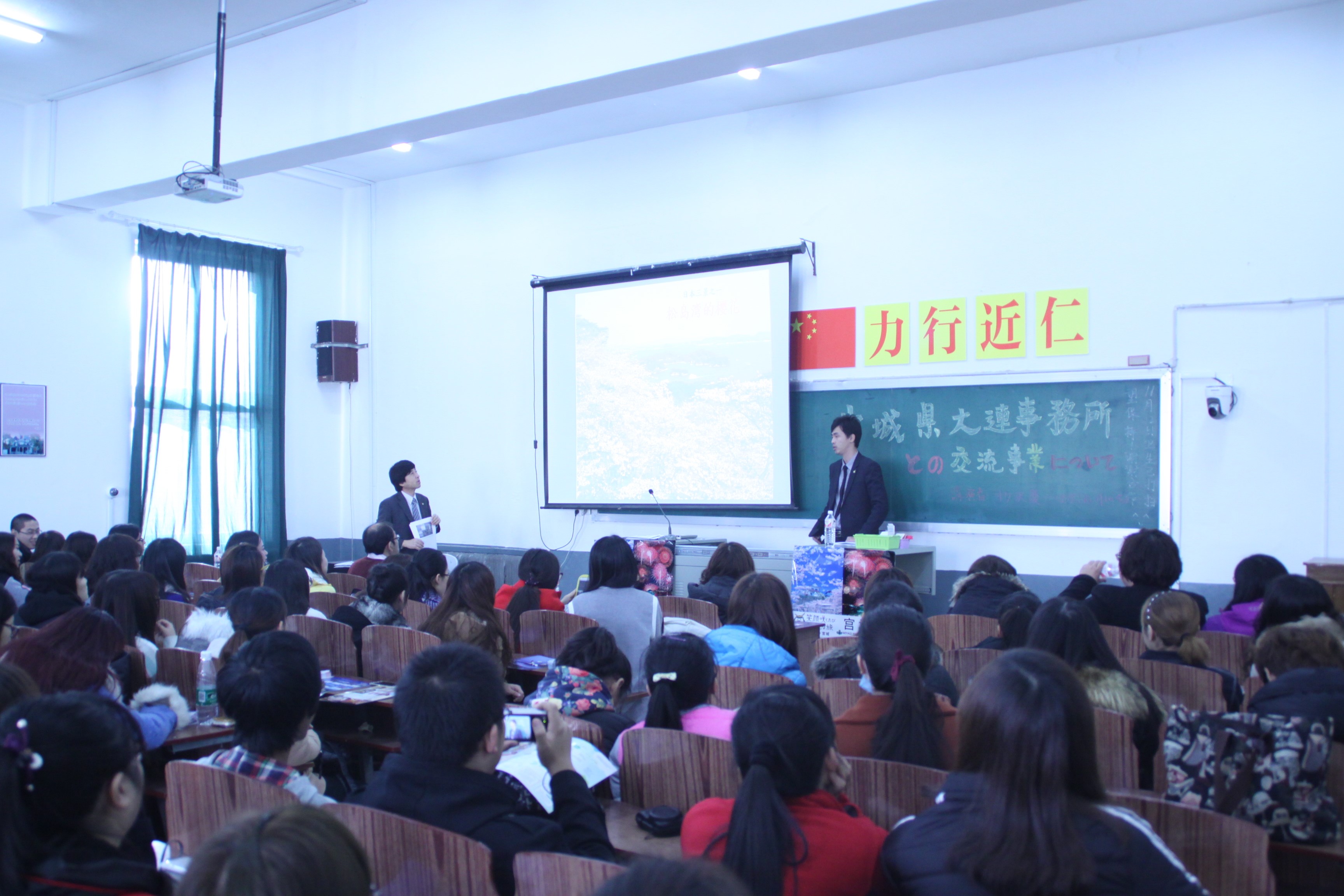 斗ケ沢慶一(とがさわ けいいち)先生是日本国宫城县驻大连事务所所长。在历时近80分钟的演讲中,斗ケ沢慶一先生针对受日本关东大地震、海啸灾害影响严重的宫城县的灾后复兴情况、宫城县的社会文化、旅游资源,以及宫城县与吉林省的友好交流等进行了生动的介绍。我院日语系教师及全体学生饶有兴致地聆听了本次讲座,积极参与了讲座过程中的交流互动。