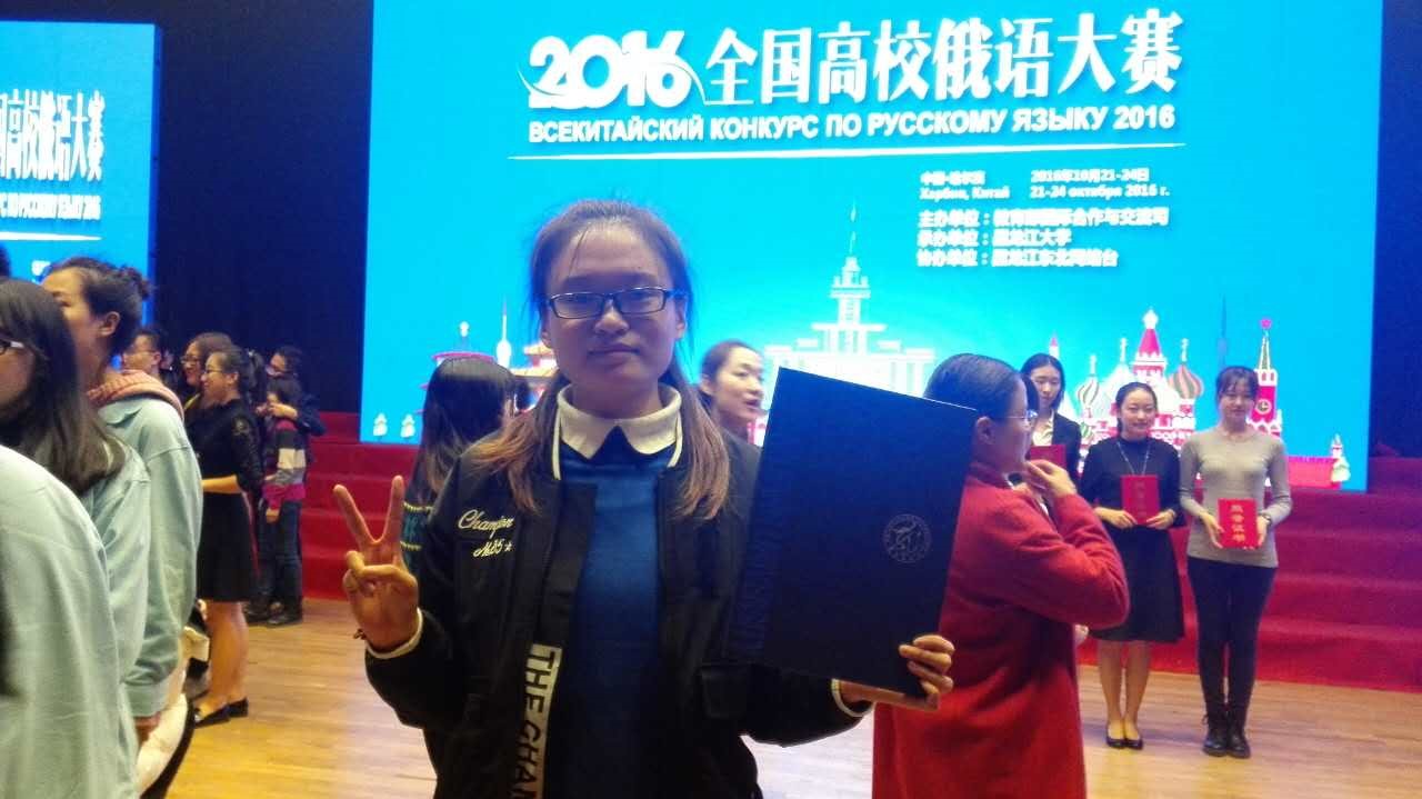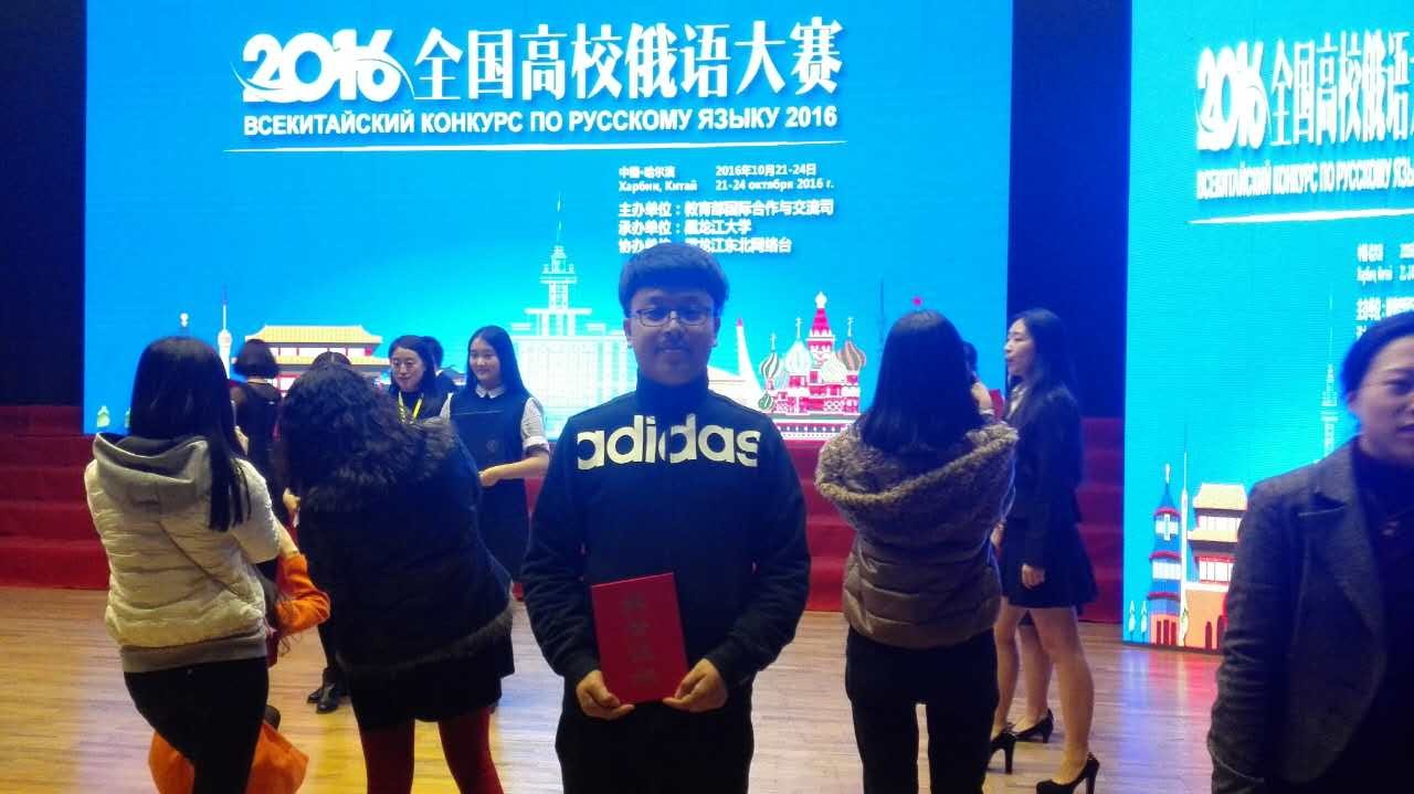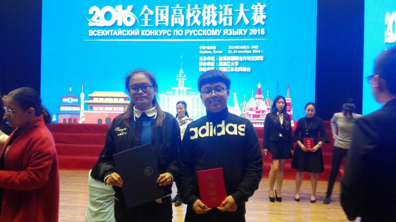 10月21-23日,由教育部主办、黑龙江大学承办的2016年全国高校俄语大赛在黑龙江大学举行,来自全国126所高校的325位选手参赛。经过激烈的角逐,我院俄语系2013级高庆同学在高年级组的比赛中以优异的成绩荣获三等奖;2015级俄语翻译专业硕士研究生张雷同学在演讲单项比赛中荣获三等奖。高庆和张雷两位同学为学校赢得了荣誉,同时也展现了我校俄语系学生扎实的知识技能和良好的专业素养。