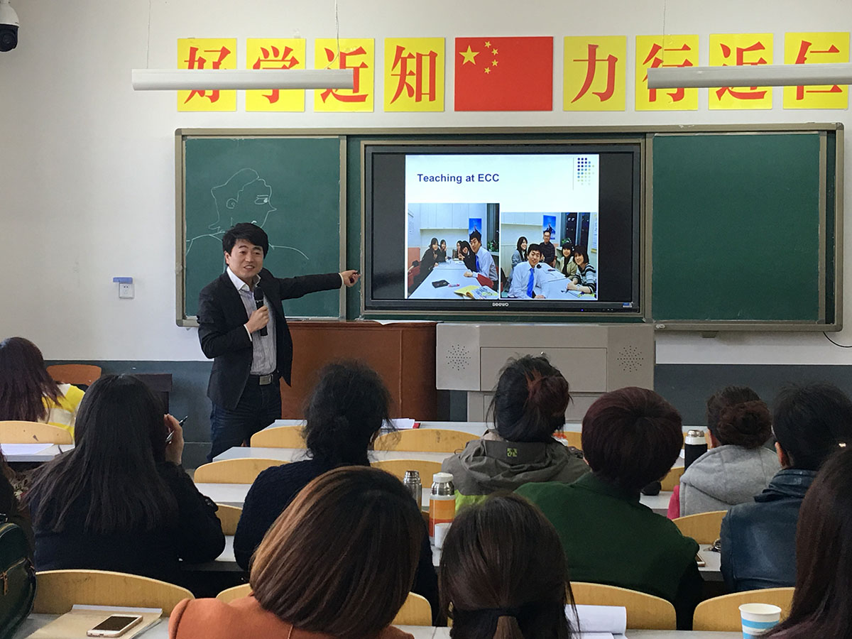 本次讲座的主题为“ECC英语学院教学方法与流程”。姜帆老师首先介绍了ECC英语学院日常教学中运用的教学方法与流程;接着,进行了现场教学模拟演示与再现;然后,就相关教学方法的理论依据进行了分析与讲解。