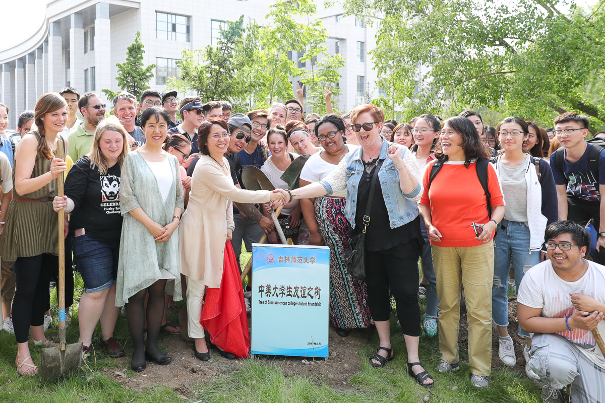 本次中美大学生环保主题活动由室内文化交流和室外共植友谊林两个部分组成。文化交流部分在我校第二教学楼2203教室举行,通过演讲介绍特色花卉树种、节目表演、游戏互动等方式进行了交流。室内环节结束后,中美大学生一路交谈着前往道园,在道园携手共同种植下了中美大学生友谊之林,合力为环保贡献了一份力量。活动最后,美国圣克劳德州立大学孔子学院院长Kathryn E. Johnson博士和吉林太阳成集团tyc122cc入口外国语学院院长李淑华教授共同为“中美大学生友谊之树”揭牌,活动在大家热烈的掌声和欢呼中结束。
