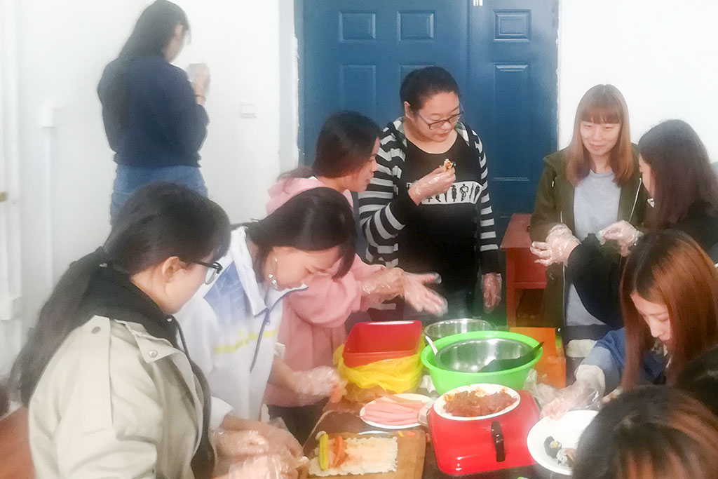 为加深对韩国文化和饮食的了解,10月9日上午朝鲜语系16级学生在2313B教室进行了韩国传统料理体验活动见习。同学们在老师的带领下制作了传统韩国食品——紫菜包饭和炒米糕条。除购买食材以外,大家还亲自参与了韩食的整个制作过程。此次活动,既锻炼了大家的动手能力,又增进了同学间的了解和友谊。活动过程大家互帮互助、其乐融融,教室里弥漫着韩食的香气和欢声笑语。