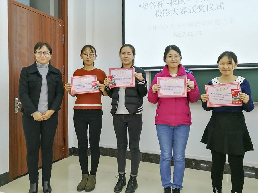 “棒谷杯——我眼中的最美校园”摄影大赛由广州棒谷网络科技有限公司赞助,外国语学院德语系主办,于2017年10月份正式启动。截至11月13日,大赛圆满结束并在长春校区研发大厦举办了颁奖仪式。本次颁奖仪式邀请了高卫红副院长、闫俊屹老师等参加。仪式中,侯川子老师再次介绍了比赛流程及评选原则,并公布了微信票选的各奖项得奖情况,最后由高卫红副院长向获奖者颁发奖状及奖品。
