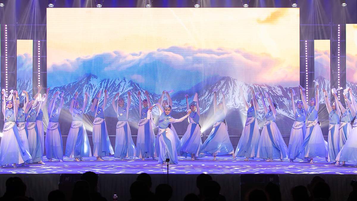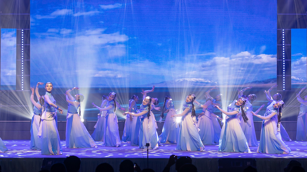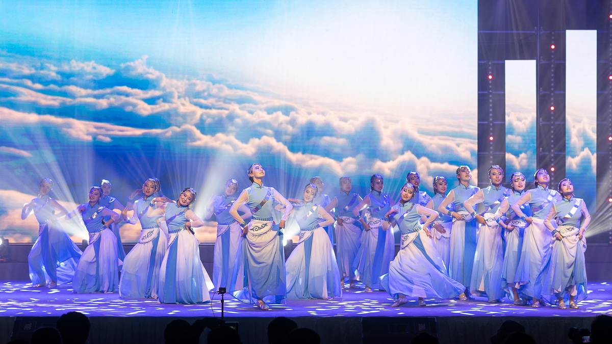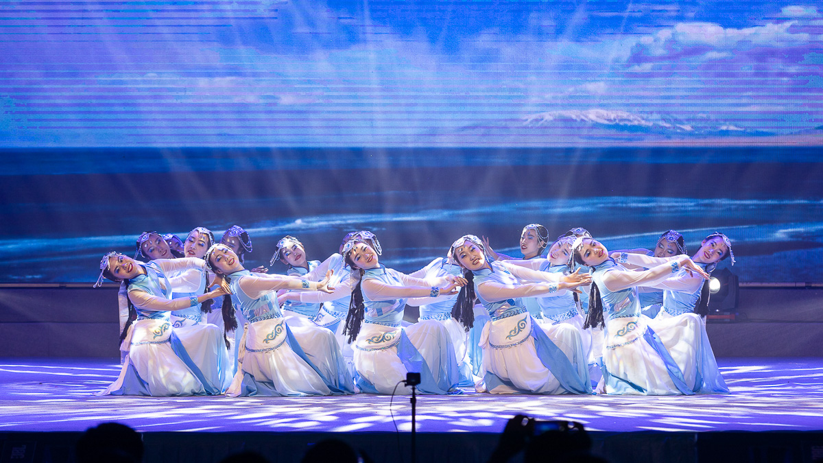 随着音乐节奏的加速,舞蹈演员们的动作由柔变刚,由快变慢,带来了这段舞蹈的段段高潮,随着灯光与裙摆发饰的呼应,每一个动作都带有藏族女孩所特有的英气与自信。