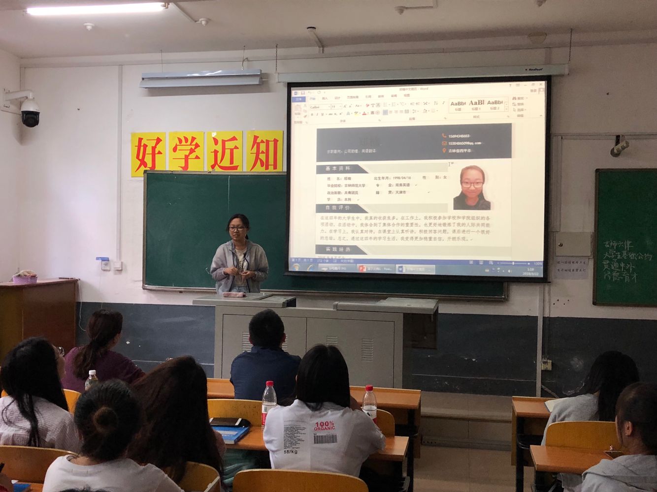为提升学生求职竞争力,5月30日下午,学院2016级商务英语专业在2152教室开展了简历制作与指导活动,商务英语专业潘雁和辅导员陈龙涛出席活动并现场指导。