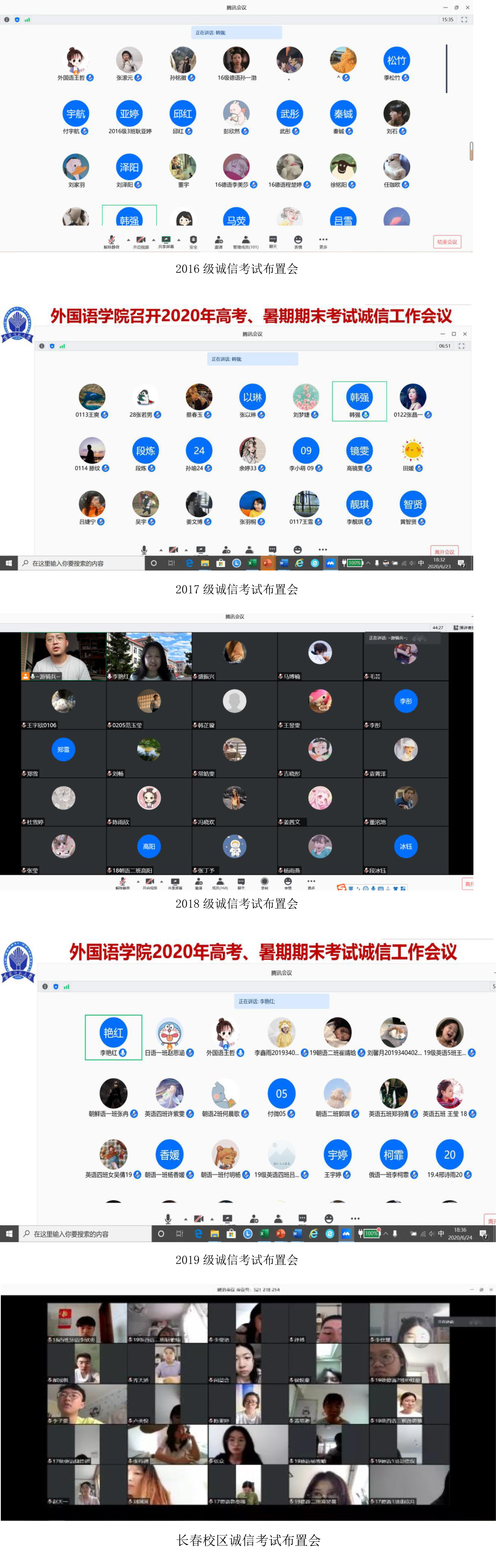 为进一步增强学院全体学生的诚信考试意识,树立诚信立德的思想理念。在期末考试与高考即将到来之际,学院于2020年6月23日-26日,组织全体辅导员针对各年级同学开展诚信考试线上主题班会,长春校区同步进行,党委副书记韩强、教学负责人、英语系系主任李艳红出席会议。