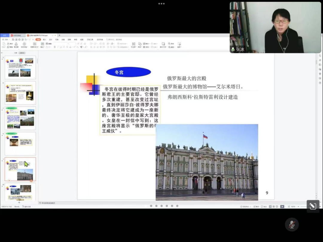 张冰以俄罗斯近代艺术为切入点,从建筑、雕塑、绘画等多个领域进行分享,对不同时间的俄罗斯艺术进行了分析对比。向大家介绍了俄罗斯巴洛克风格建筑的奢华富丽及古典主义风格建筑的宁静朴素大气,带领大家走进了近代俄罗斯丰富多彩的艺术世界,体会到了俄罗斯近代艺术的魅力。张冰指出:“俄罗斯艺术文化是世界艺术殿堂中的宝贵财富”,鼓励大家要不断加强对俄文化交流与合作,加强世界语言文化学习。