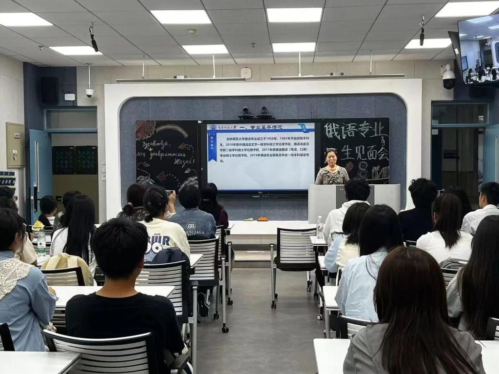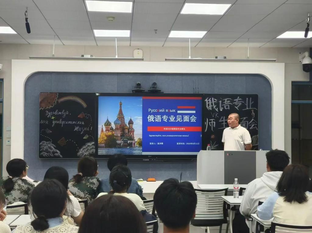 秋风轻拂,校园焕新,金叶铺道。在这收获的季节里,新生们怀揣着梦想与希望,踏上了这段崭新的学习旅程。为了帮助新生可以全面、深入地了解专业的培养目标、课程设置、教学方法以及就业前景,从而明确自己的学习方向和兴趣所在。9月12日晚,俄语系在11903教室举办了俄语专业师生见面会暨新生学业培训会。系主任王春红副教授出席并主持会议,专业教师、优秀校友代表、学生代表、全体新生及班代参加会议。