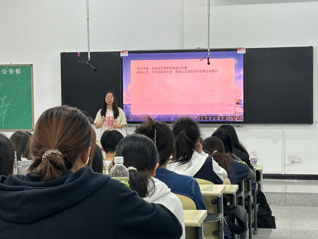 会上,刘文月率先发言,她结合自身参赛经历,详细介绍了全国大学生英语竞赛的题型特点与考察重点。刘文月强调,扎实的词汇基础是关键,建议同学们通过阅读英文原著、观看英文影视剧等多元化方式积累词汇,并分享了自己制定的科学背词计划。同时,她还针对听力、阅读、写作等题型,分享了独特的解题技巧与训练方法,为同学们指明了备考方向。
