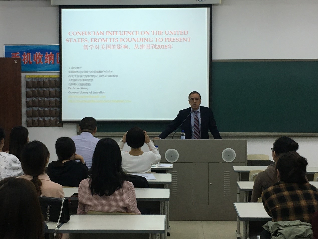 9月20日,外国语学院邀请美国纽约皇后图书馆劳瑞顿分馆馆长、美国圣约翰大学兼职教授、我校客座教授、杰出校友,美籍华人王小良教授在长春校区研发大厦707教室做了一场“儒学对美国的影响:从建国到2018年”的讲座。讲座由副院长高卫红教授主持,2018级外国语学院研究生聆听了讲座。