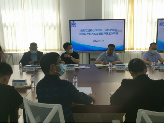 2022年5月31日上午九点,杨小天校长、吴振利副校长及党校办、教务处、人力资源处、学生处、校团委、马克思主义学院、外国语学院、体育学院和化学学院等部门有关领导莅临我院走访调研,并在实习实训教学楼远程观摩室与文学院、职业技能教研部各专业系主任、教研室主任亲切座谈。会议由文学院院长、职业技能教研部主任孙艳红主持,文学院、职业技能教研部领导班子及相关教师参会。