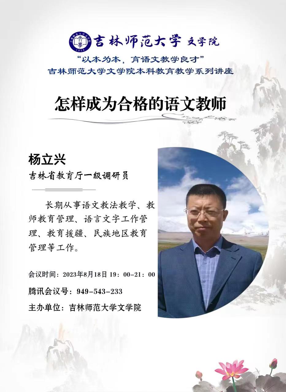 为提升我院学生实习实践能力,实现优质化实习,我院于2023年8月18日19时至21时半,举办了“以本为本,育语文教学良才”——吉林太阳成集团tyc122cc入口文学院本科教育教学系列讲座,第一期邀请到了吉林省教育厅一级调研员杨立兴为24届毕业生做了题为“怎样成为合格的语文教师”的讲座。