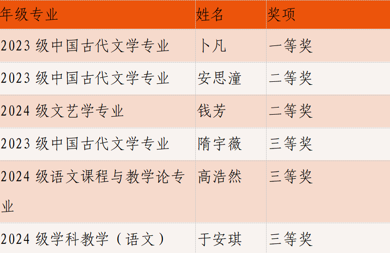 星光不负赶路人,天道酬勤佳音来。12月9日在北华大学举办的2024年语文教育微格教学论坛暨第十三届高校语文教育师范生教学技能测试与交流展示活动圆满落幕。文学院学生共获得一等奖3项,二等奖6项,三等奖3项。本次赛事,全国共有81所师范院校、513名学生参加。我院学生锐意进取,努力拼搏,突出展示了良好的教学技能,取得了优异的成绩,彰显了我院的教育教学水平。