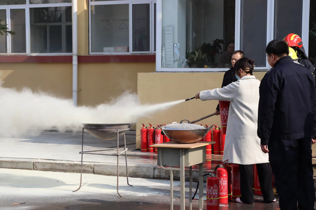 同学们观看消防员的灭火演示,消防员动作娴熟地拿起灭火器,拉开保险销,对准火焰进行喷射,火焰迅速熄灭,动作干练。