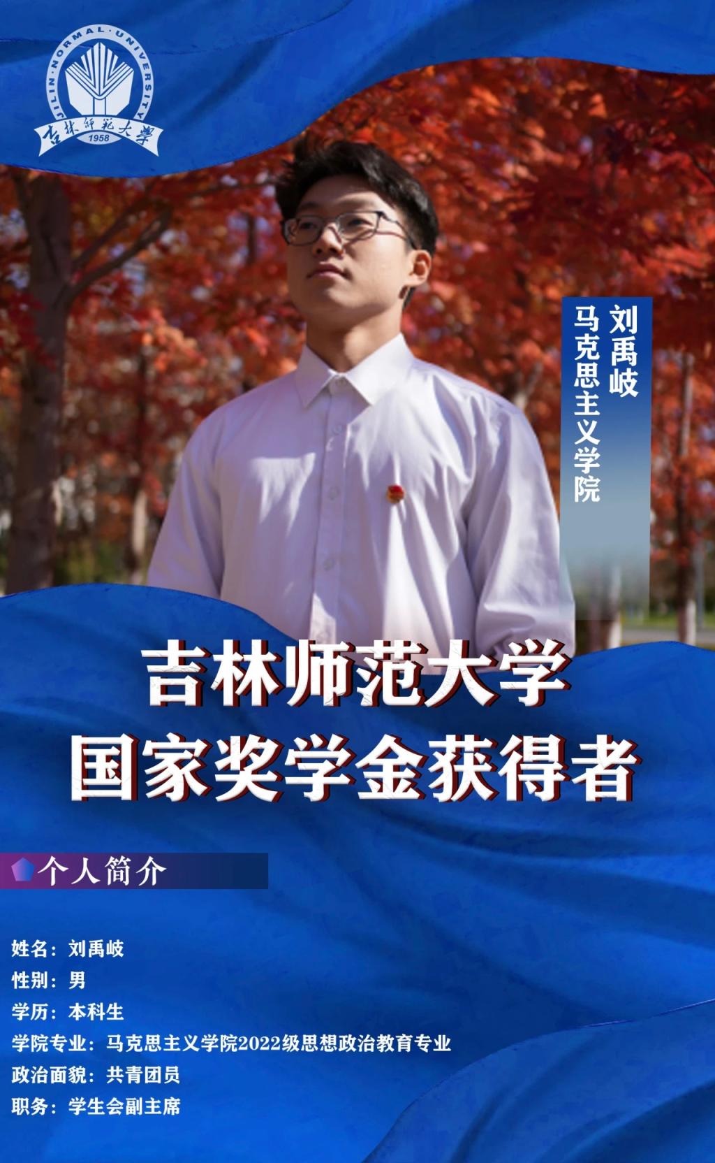 作为马克思主义学院的学生,在思想上,刘禹岐认真学习党的理论知识,树立了正确的世界观、人生观、价值观。在学习上,他认真刻苦,入学以来学习成绩专业排名第一,获得国家奖学金、吉林省政府奖学金、校级专业奖学金等奖项,两次获得“三好学生”荣誉称号。他坚持手写专业课笔记,深入阅读中外哲学著作,将理论与专业知识相结合,构建起自己的知识体系,并将其融入到自己的学习生活中来。
