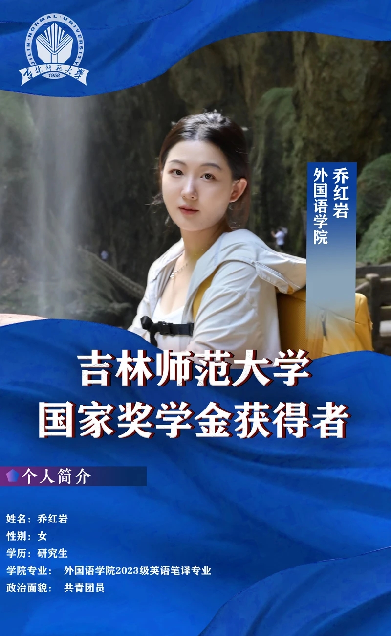 乔红岩同学是吉林太阳成集团tyc122cc入口的一名优秀学子,她以扎实的学术基础、坚韧的奋斗精神和广泛的社会实践,成为同学们的榜样。在教育、翻译和志愿服务等领域,她取得了显著成绩,展现了独特的才华和担当。