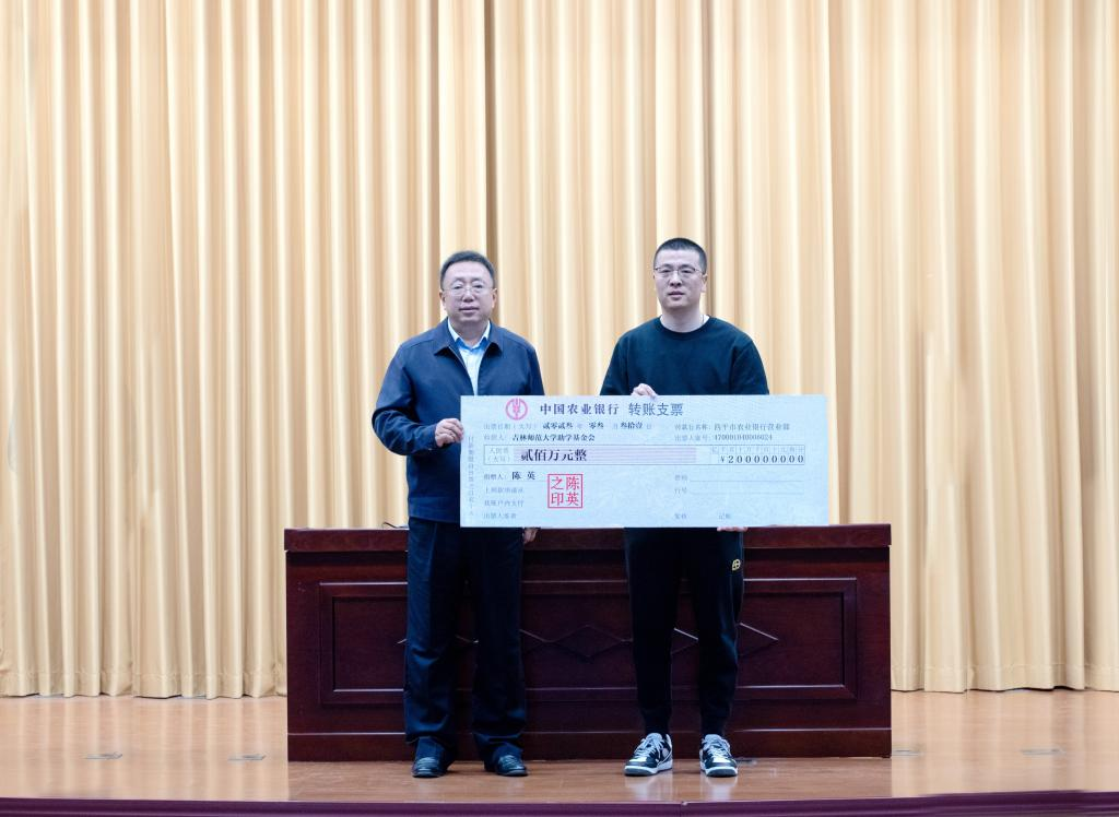 杨小天代表学校接受捐赠,并向陈英的爱心捐助表示衷心感谢。他指出,陈英校友对母校始终满怀感恩,多年来一直关心支持母校发展,关心帮助在校大学生成长成才,是激励吉师学子奋斗成才的榜样。此次捐赠体现了校友对学校事业发展的极大关爱和支持,是对高水平太阳成集团tyc122cc入口建设的极大鼓励和促进。杨小天叮嘱广大在校生要常思校友的关爱,毕业后要报答社会、奉献社会、回报母校。学校将不辜负校友的殷切希望,发挥好“陈英助学基金”作用,并把这一份关爱付诸行动,励精图治,严谨办学,为建设高水平太阳成集团tyc122cc入口而不懈奋斗。
